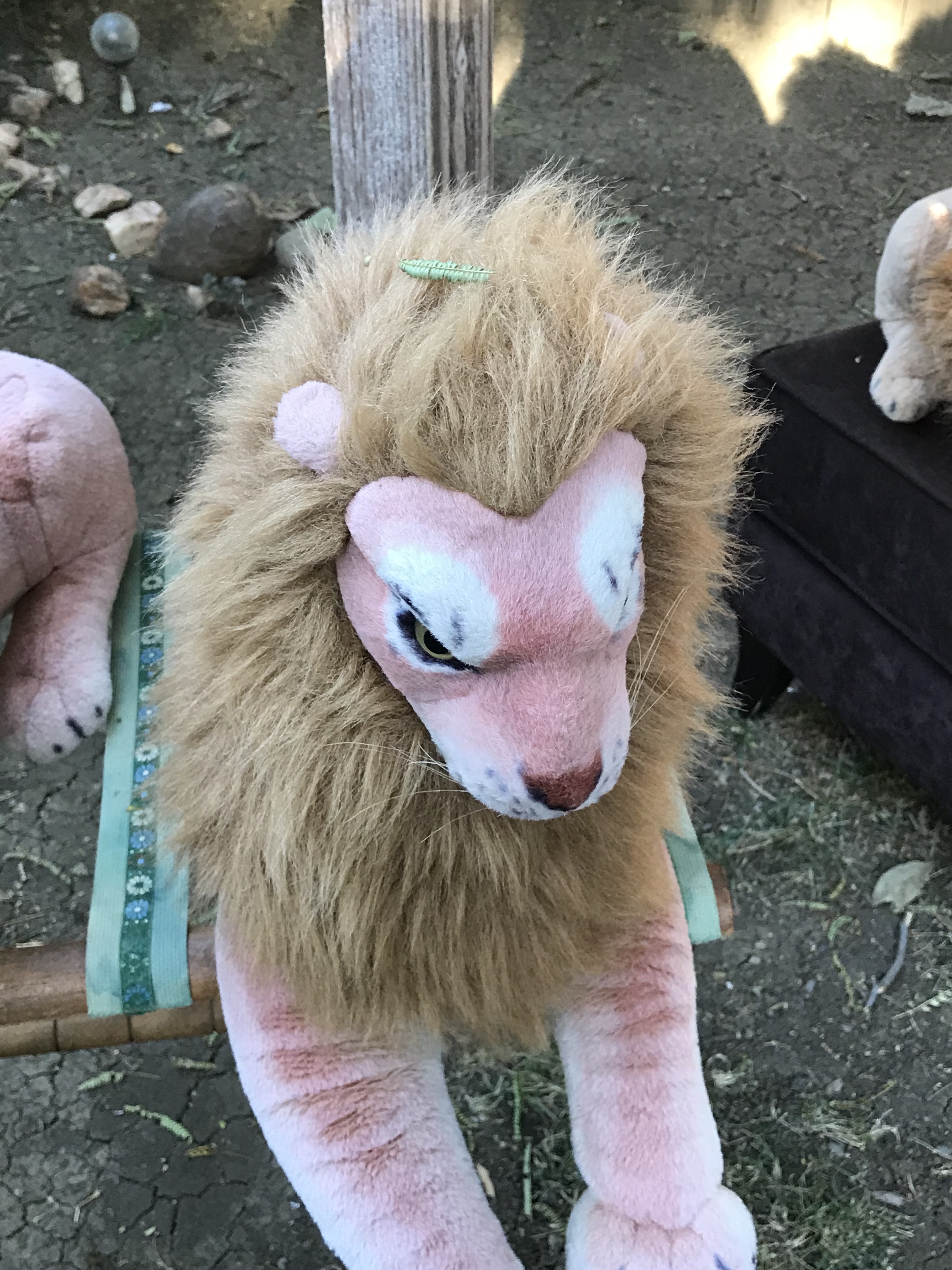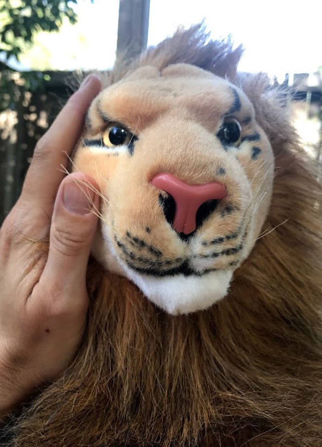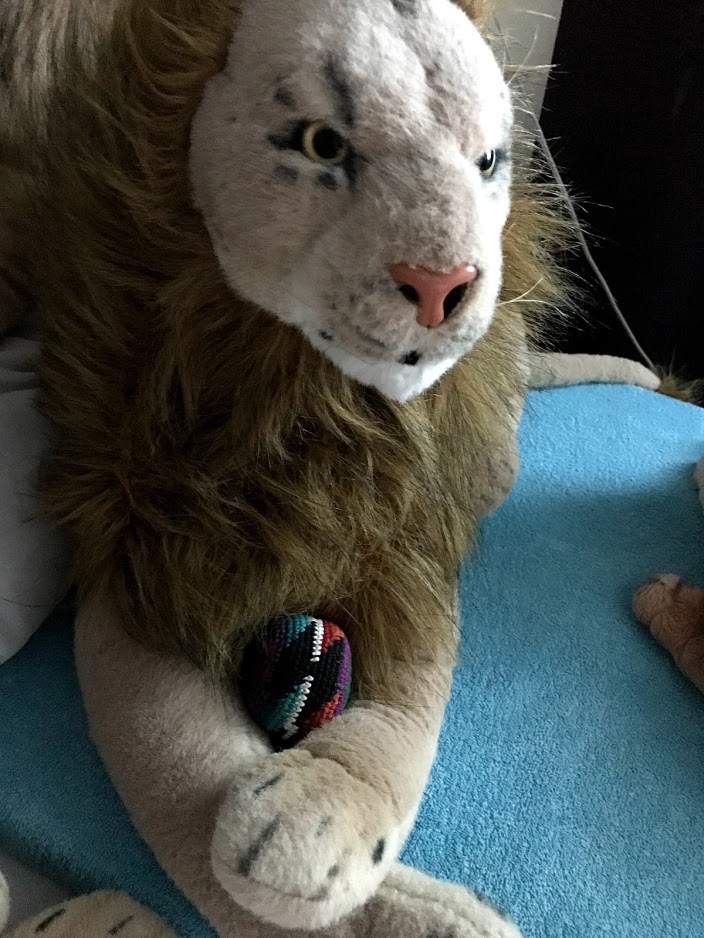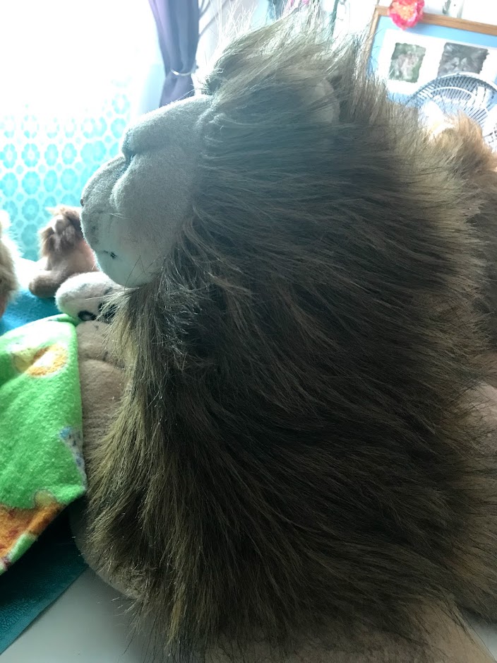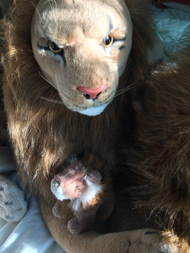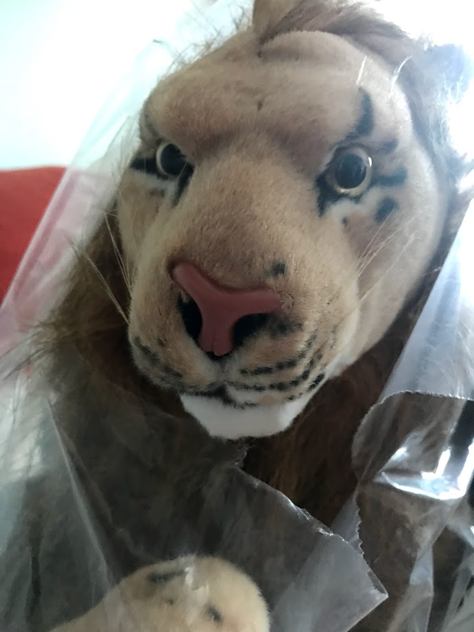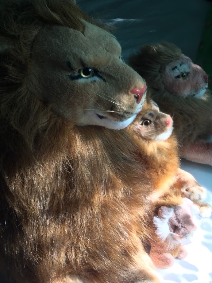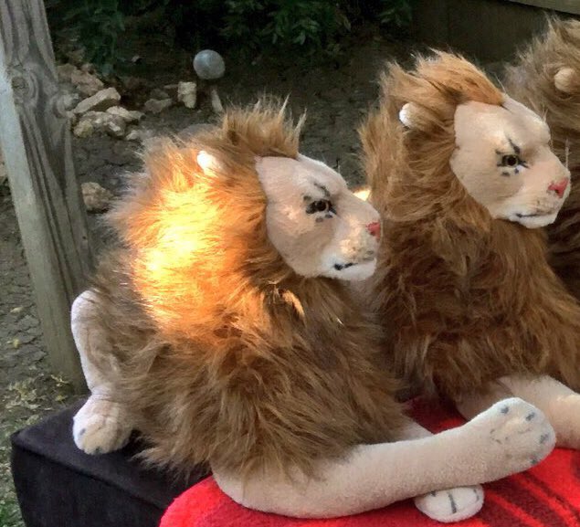 And time and time again, when I was at my wit’s end, the flame beneath my earthly despair and loneliness began to flicker, encouragements came, and still come: “Hang in there!” Let me give a few examples. I’m completely in love with the new inner crew Rob Nanninga lion “Surprise” with his beautiful soft mane, his attentive and lightly ironic, heavenly eyes. I’m head over heels for all the inner crew Rob lions, and the infatuation strikes again and again. And last March, my mind made a beautiful connection: the lion had literally arrived like a ball, and another word for ball is “Orb.” That word is itself a skeptical wink because “orbs” in photos are often seen by paranormal believers as spirits or energies. Suddenly, the word Rob rolled over to Orb, and then I immediately had a new name tag made for Rob Surprise Lion. My mind then continues to play with the name of the new Rob lion: Surprise Orb, Supreme Orb, Sublime Orb, Superb Orb, Super Orb, Stunning Orb…